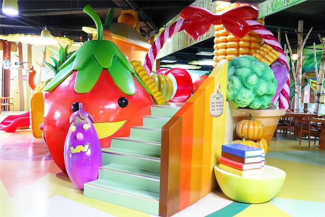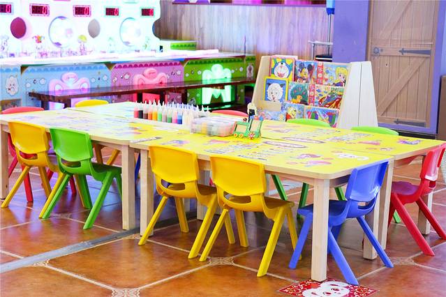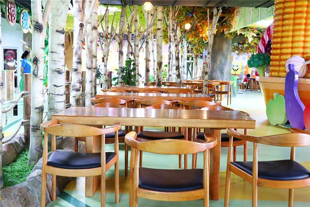 餐厅桌椅采用实木制成,旁边还有一排人工小树,让人在就餐的时候有一种丛林体验。另外还有滑滑梯可以玩,滑滑梯的构造十分可爱,小朋友看着就很喜欢。