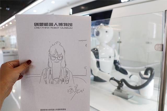 会画画的机器人能在短短时间以内给你画一个自画像,你只需要坐在座椅上等着他“咔擦”帮你拍一张照片就行,剩下来的时间机器人会按照拍摄的内容给你画画。