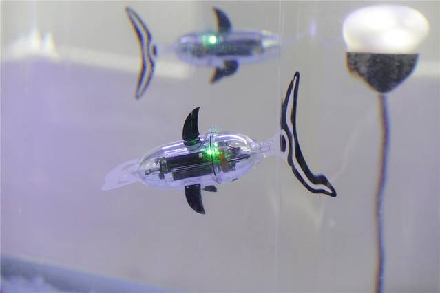 机器人小鱼非常可爱,身上的灯一闪一闪,还能自动识别周围的同伴避免发生碰撞。