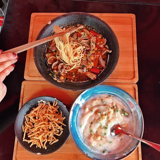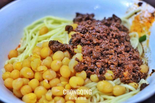 这家店在 重庆 开了好多家了,在我住的楼下就有一家,应该算是老字号了,很有年头了,豌杂面也是朋友推荐我一定要尝试的,瘦肉臊子加上黄色的豌豆,调好的酱料在碗底,还有几根空心菜,看上去搭配还蛮奇怪的,但是搅拌均匀后,入口的那一刻好吃哭了。