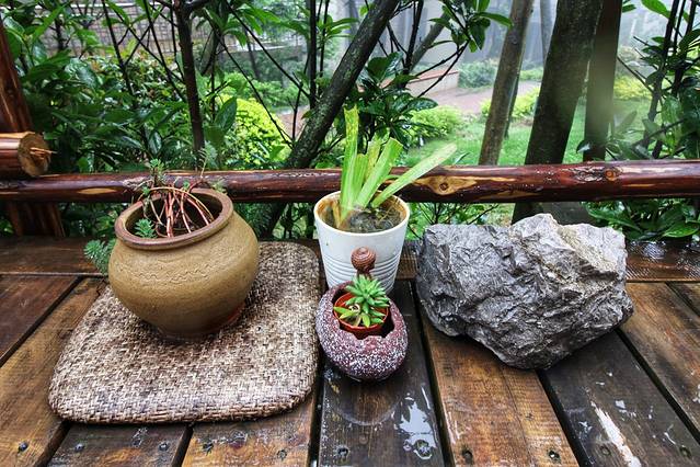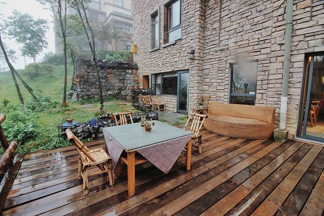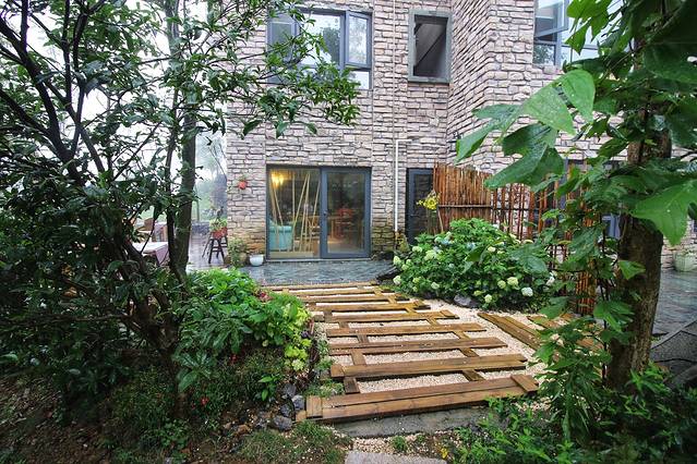 这个是云上小院民宿的大厅外部,绿树和花草环抱,曲径通幽,一阵小雨过后小区里的植被都被雨水洗礼了一遍,空气清新。