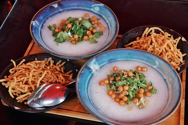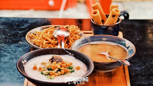 还没开逛二厂,就已经在二厂门口的网红店吃上了,大王油茶据说也是这里比较有名的店,心想一家油茶能做成什么网红的样子,三个人点了一些,的确和我想象中的油茶不一样。 重庆 人除了吃小面外,油茶也是早餐之一,油茶里的大米和糯米配比的恰到好处,就是为了在搅拌的时候,可以成为糊状,有点藕粉的意思,加上 西北 面粉制作的馓子,酥脆的口感配上糊状的油茶,加上葱花、豌豆、辣椒等,一碗油茶也是如此讲究和有卖相,不仅能当早餐,当正餐吃也是可以的。