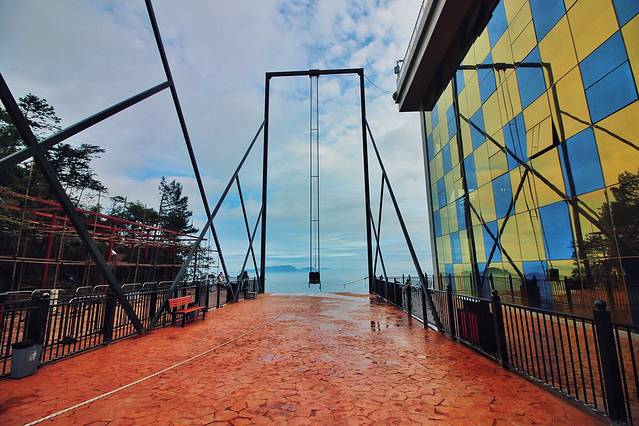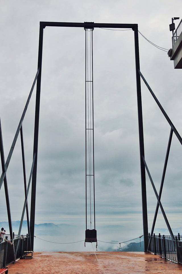 从西门进来就靠近了高空项目区,首先映入眼帘的就是18米高的悬崖秋千,先用一张朋友发给我的图(下图)的视角来给大家看看什么叫快垂直90度,底下是悬崖的感觉,只是这个天气也太好了,我就没这个运气了,在雨中玩了一天,呜呜呜。