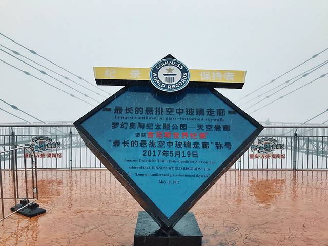 接下来旁边的楼梯上去要去体验的就是一个巨大的“A”字型玻璃廊桥,叫做“天空悬廊”,下雨天悬廊上人并不是很多,悬廊伸出去悬崖上空长度达80米,被吉 尼斯 世界纪录认证为“世界最长的悬挑空中玻璃廊桥”。吉 尼斯 世界记录的认证牌上显示着吉 尼斯 世界纪录的认证书。