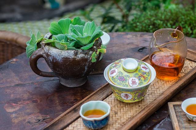 走着走着,觅到一处茶馆,要一碗 重庆 老荫茶, 重庆 的老荫茶相当于 北京 的大碗茶,是最大众化的产品。老板说这老荫茶啊,不是茶叶,而是一种树叶,在高山密林之间,叶子比一般茶叶厚、大,枝可入药作清热解毒用。沸煮之后,茶汁变成了红褐色,能生津解渴。
