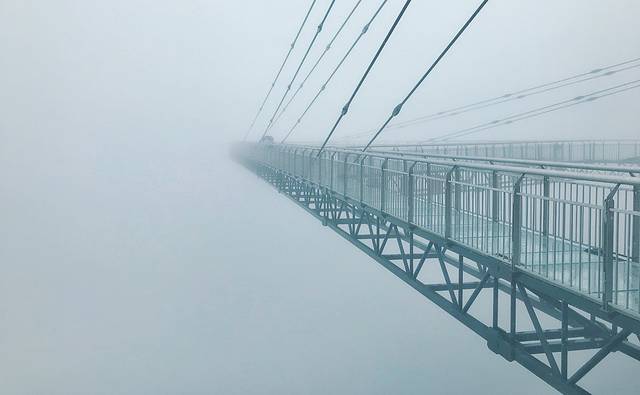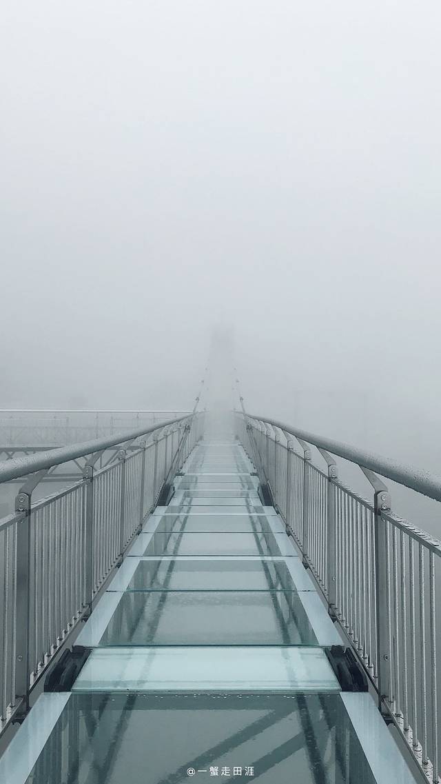 雾大所以走上去向远处走去,有一种走到尽头回不来的感觉,雾中的玻璃廊桥上也是给人神秘的感觉。小心翼翼的走上去,廊桥也会微微颤抖,惊险又刺激,天空之城既视感。
