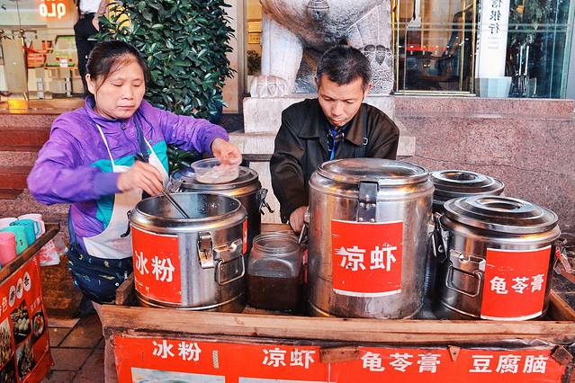 看看冰粉的卖相如何,晶莹剔透,里面加了山楂片、枸杞、葡萄干,如果再加一个喜欢的 重庆 味道,就是这样的路边摊冰粉,也是火锅必备好搭档。