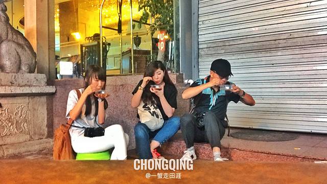 已经夜里12点了,爬梯并没早早结束,三个人大街上已经溜了几圈了身上的火锅味还是如此重,此刻的解放碑竟然还是灯火通明,大街上看到很多卖冰粉的路边摊儿,火锅店没有吃到冰粉不甘心,于是买了就往路边一坐开始又吃上了,正好吹吹风,降降火。这种感觉已经很久没有了,与朋友们随地而坐,边吃边聊,也是非常难忘和开心的夜晚。