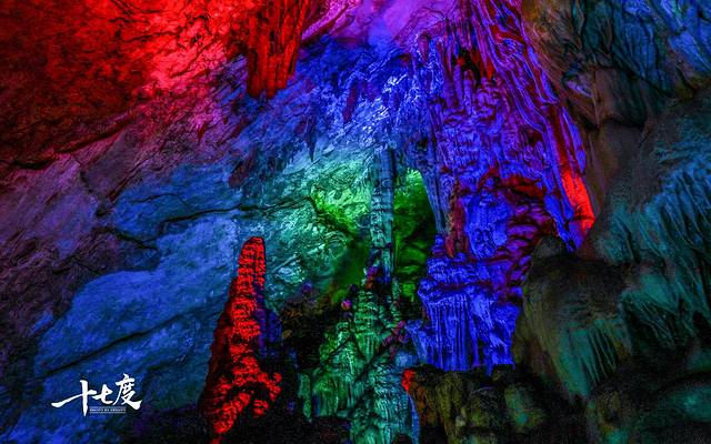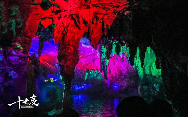 一路往前,在各种五颜六色的灯光照射下,绚丽多姿的钟乳石千奇百怪,形态不一,人物猛兽,花鸟虫鱼,芸芸众生在大自然的神笔下勾勒,亦幻亦仙,有的象一朵巨大的灵芝;有的像怪兽锋利的牙齿,狰狞的尖牙,巨大的嘴巴在灯光的照耀下面目狰狞。置身于这样一个迷一样的地下宫殿,仿佛一不小心,就走入了另外一个迷幻世界,只有时而触摸到斑驳冰冷的洞壁,从指尖传来的透彻的冰冷方觉还在人间~
