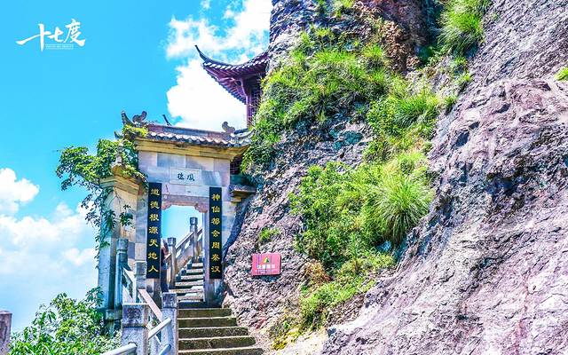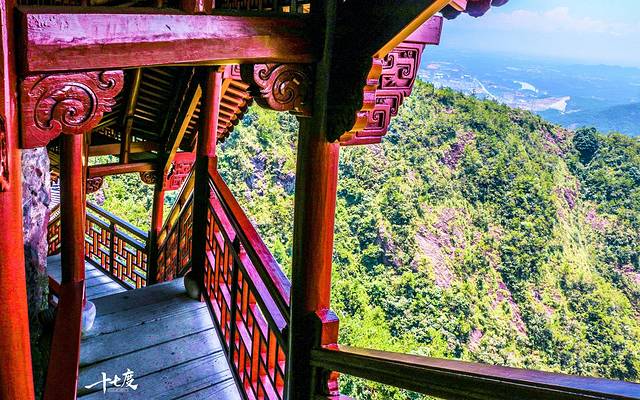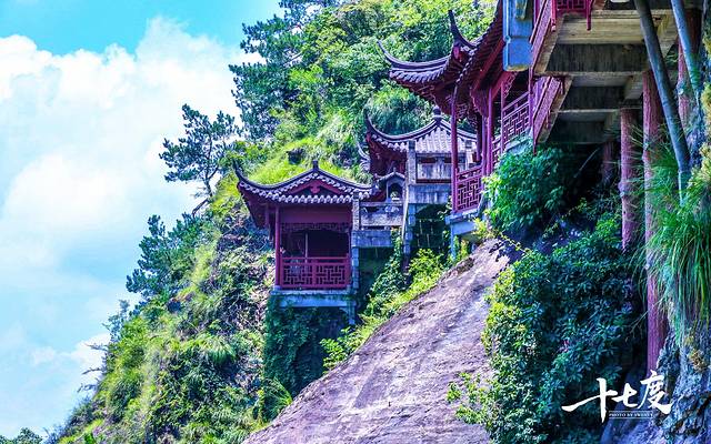 愈往上爬,愈发感受到天空的宁静深远,曲径蜿蜒宛若长龙,行走在这里,俨然在云中漫步,身心仿佛被蕴藏其间的馥郁灵气所浸润;加快脚程, 弯曲曲的青石板路的尽头就是悬空的地藏王大殿,一半嵌入岩腹,一半凌架悬空, 叹其精巧用工的同时,也不得不感叹古人的智慧与能力~
