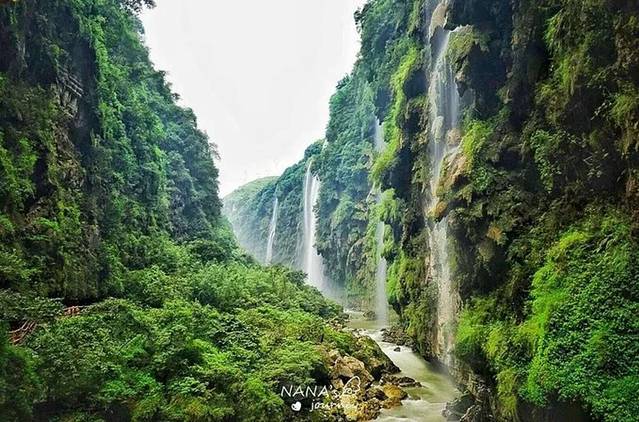 我会带你去马岭河峡谷,看大大小小的瀑布如万丈银丝,如万马奔腾,山间林木郁郁葱葱,这里是“地球上最美丽的伤痕”。