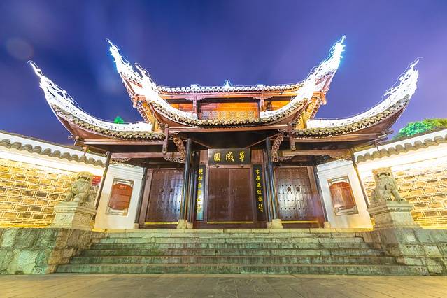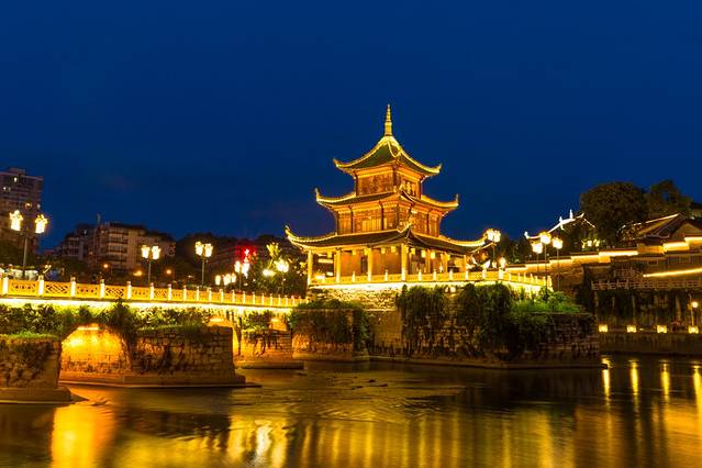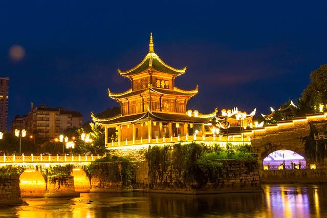 甲秀楼建于明朝,后来被毁了,然后在1909年宣统元年重建,再不断重修才变成了现在的模样。甲秀楼一共3层,建于桥上。桥上还有一个亭子叫做“涵碧亭”,许多爷爷奶奶晚上的时候坐在亭子里聊天吹风。