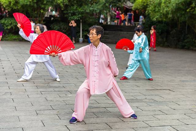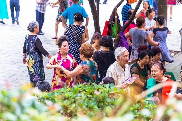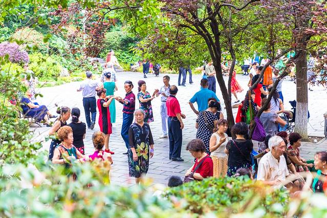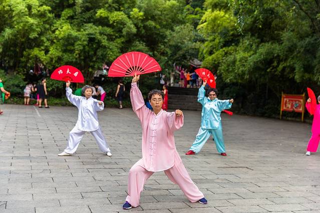 景区门口有许多广场,当地的居民工作日的时候也让自己变得拥挤,有父子俩在这里打羽毛球,有年纪偏大的夫妻在这里跳交际舞,有爷爷在这里练太极,有奶奶在这里练剑,也有许多人在公园的亭子里坐着。