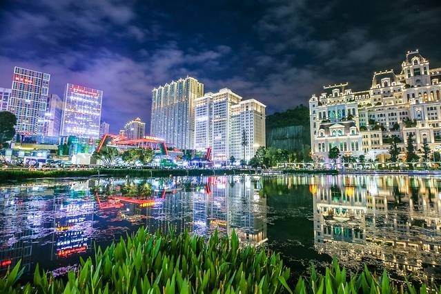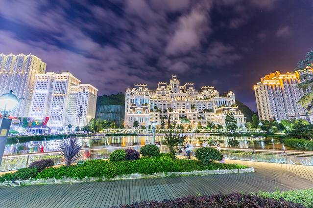 湖的右侧有两栋高楼,高楼上的led灯上写着许多广告字幕,当然也有我爱贵阳以及关于世界杯的字样,我等了许久才拍下我爱贵阳。湖的对面是这里最闪耀的建筑,叫做“白宫”,没错,就是跟美国白宫同名。这座建筑是一个私人宅院,无论是占地面积还是地理位置,这样一个私人的建筑在这里绝对被众人议论,夜晚的白宫格外美丽,许多人在这里拍照,就是拿白宫作为背景。
