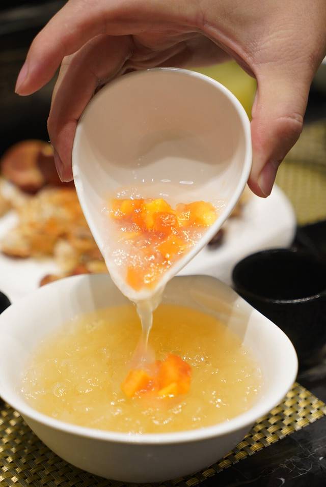 接着是一道甜品,木瓜银耳羹,因为铁板烧吃多了油腻,用来漱口解腻用,银耳肉厚滑润,冰镇感沁人心脾,一个字“爽”。