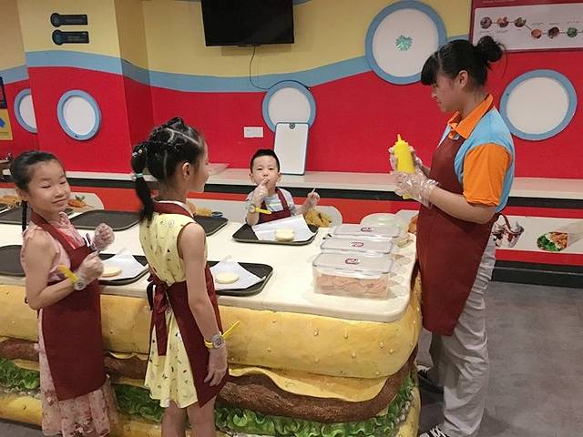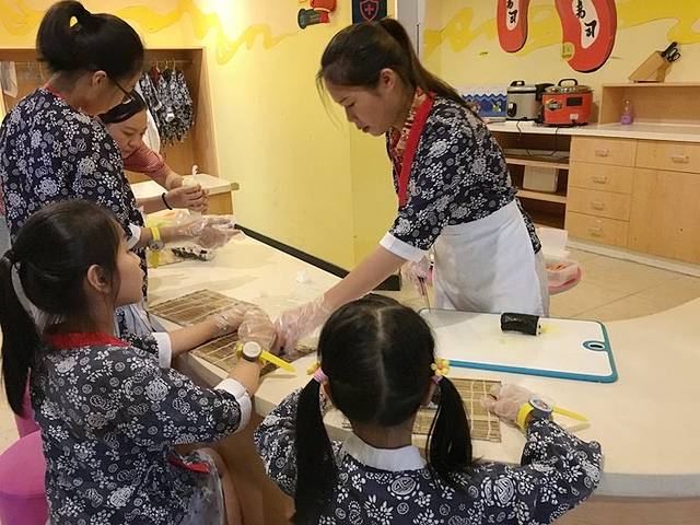 还有做寿司和汉堡的商铺,小姐姐们教他们手把手做出美味的食物,让他们知道“谁知盘中餐粒粒皆辛苦”,做出来食物分享给爸爸妈妈也是一种幸福感的传递吧。