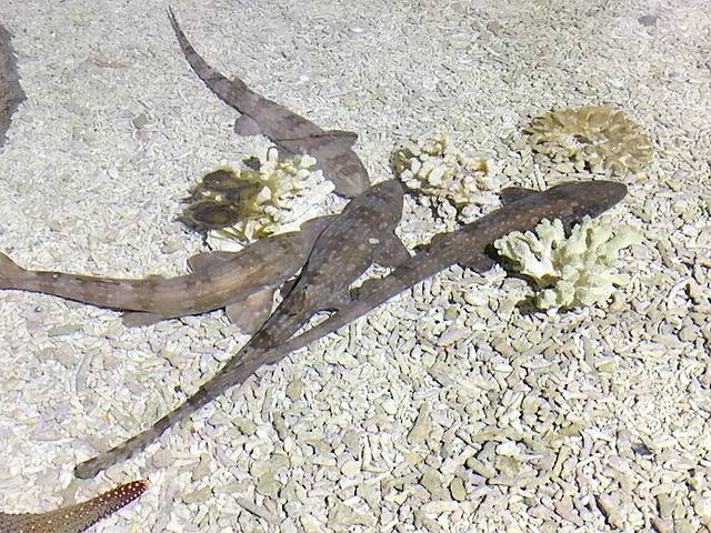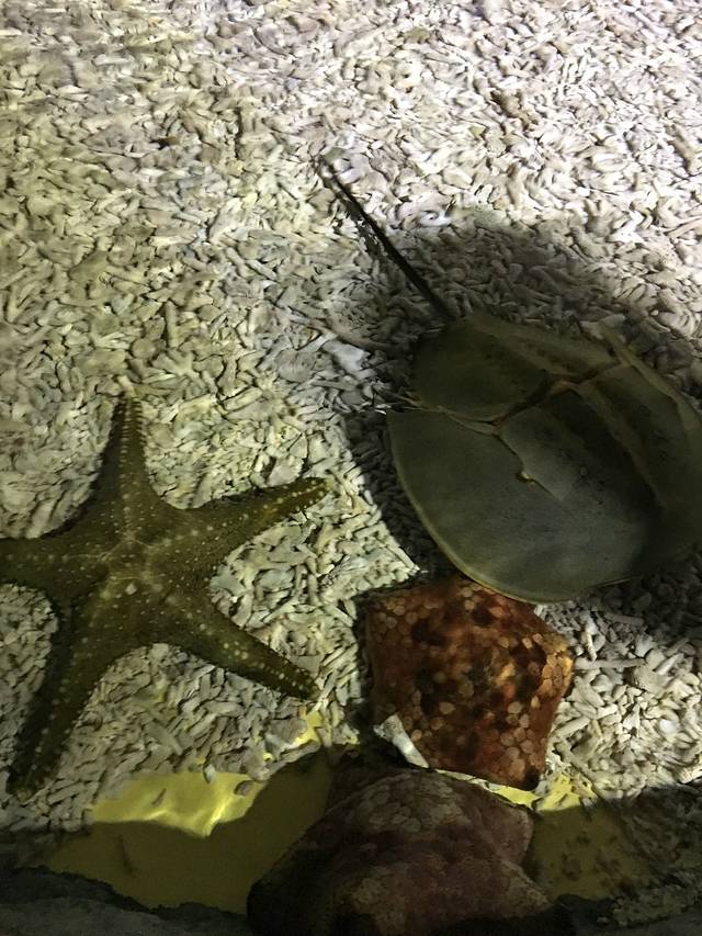 进门后就有一个触摸池,这里有海星、鲎等生物随便摸,旁边还有洗手台,毕竟触摸过海水需要用清水洗干净。