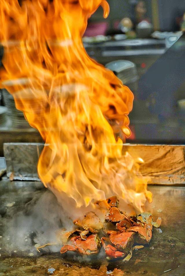 俗话说“不会放火的杂技员不是好厨师”,压轴大戏是火炙活蟳,将蟳对半切,煎至金黄,加上大葱去腥爆香,霸气泼上料酒,点上火,“唰”的一声火光四射,扬起一米多高的火焰,然后惊叹不已,是蟳的怒火还是酒的热情之火,我们吃了才知道!