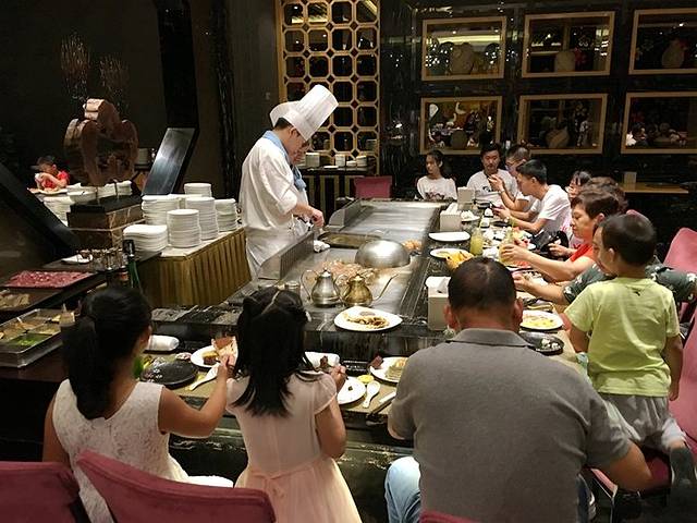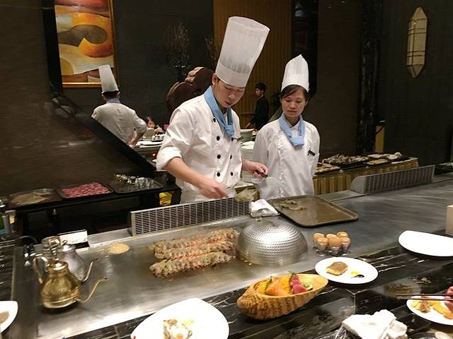 这里的铁板烧是现做现吃的,所以上菜可能慢一些,不过有很多自助水果、蛋糕可以先填充下饥肠辘辘的胃了。进来后我们10人围着厨师做好,有种“排排坐吃果果”的感觉。