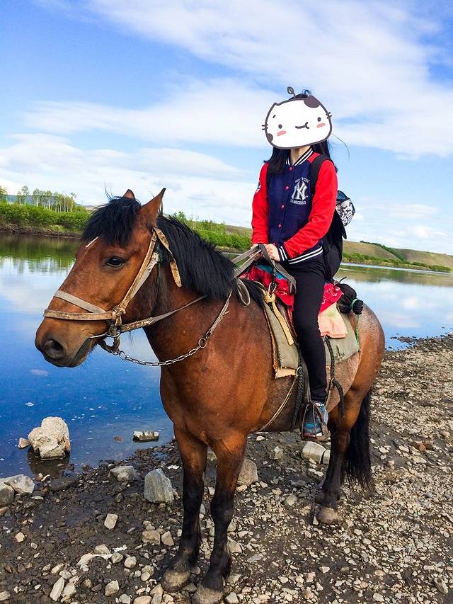 我们在辽阔草原上“漫步”,越过一个又一个坎儿,穿过一片又一片草,最后到达根河湿地边缘。虽然座下的小黄乖得不得了,我还是全程很紧张,不停地跟它“对话”,让它稳一些慢一些,既然教练说马儿能感觉到我,那我这么碎碎念着它说不定也能听得懂咯。