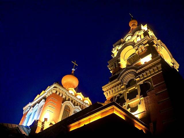 满洲里的建筑都有一个俄式的屋顶,点上灯看起来非常奢华,但也免不了稍显浮夸。老板带我们去了内蒙古大学,为什么要去那儿呢?老板说从那里的一个掉头,我们能看到比教堂更美的灯火。