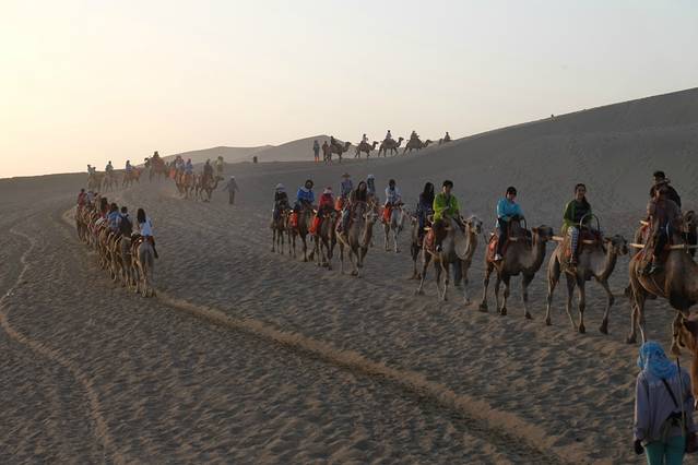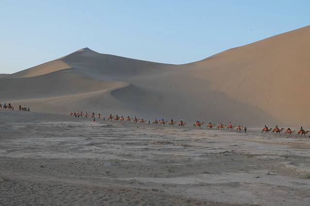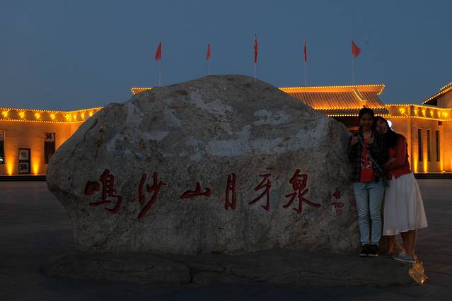 月牙泉是一处神奇的漫漫沙漠中的湖水奇景。鸣沙山下,泉水形成一湖,处在沙丘环抱之中。泉在流沙中,干旱不枯竭,风吹沙不落,蔚为奇观。相传泉内生长有铁背鱼、七星草,专医疑难杂症,食之可长生不老,故又有“药泉”之称。据说,月牙泉早在汉代就是游览胜地。史载,汉武帝得天马于渥洼池中,后人疑月牙泉即汉渥洼池,遂立一石碑曰“汉渥洼池”。“四面风沙飞野马,一潭之影幻游龙”。因此月牙泉更增添了传奇色彩。
