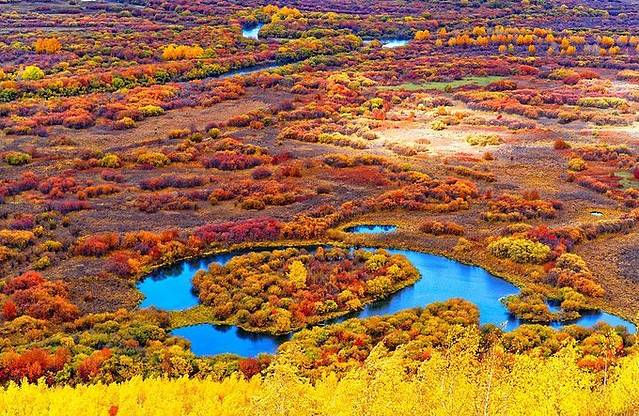 大兴安岭的秋天,一幅五彩缤纷的山水画,绝不是用七彩颜料所能绘成的;大兴安岭的秋天,一首多音色的交响乐,绝不是七个音符所能弹奏的。因为她因袭了春天青山的浪漫,蕴含了夏日林海的热烈,展现了全年的饱满与丰硕,预示着冬天林海雪原的壮丽与高洁。