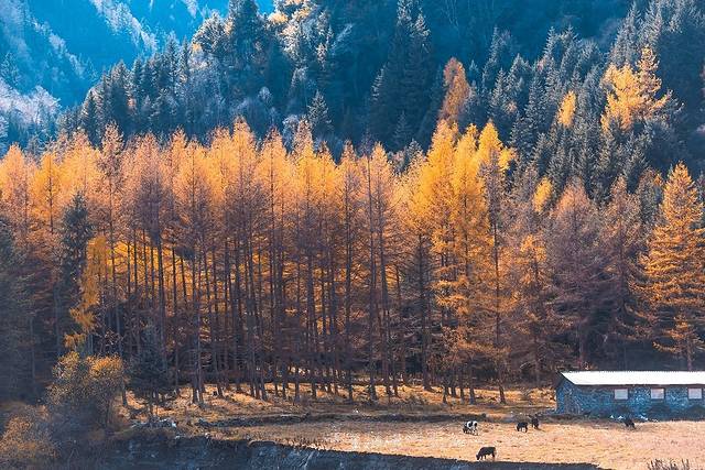 上班金秋是米亚罗的四季之最,10月是米亚罗的全年最美,3000多平方公里的山林,被点染上了十几种绚丽的色彩。秋风吹过,河谷两岸密林中的枫树、槭树、桦树、鹅掌松、落叶松等渐次经霜,树叶被染成绮丽的鲜红色和金黄色,蓝天白云、山川河流共同勾勒出一幅醉人画卷。