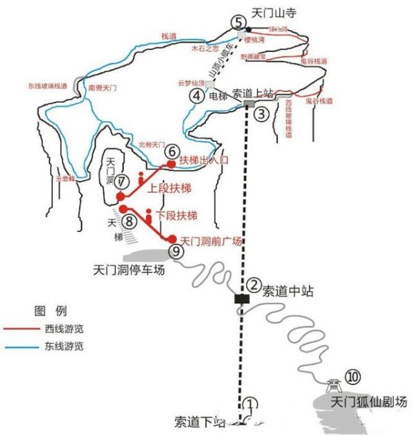 先山顶再山下,索道上山,公路下山。具体:索道上山—山顶游览—乘穿山扶梯下行至天门洞—乘景区游览车下山至山门—换乘免费班车至索道下站。