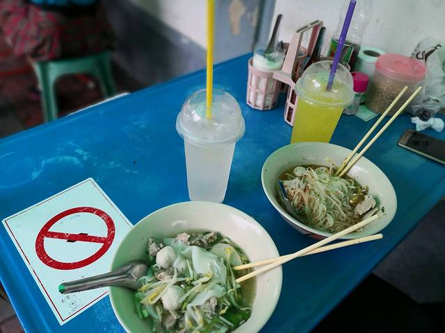 两碗米线两杯柠檬苏打冰水,140泰铢,28块钱搞定。
