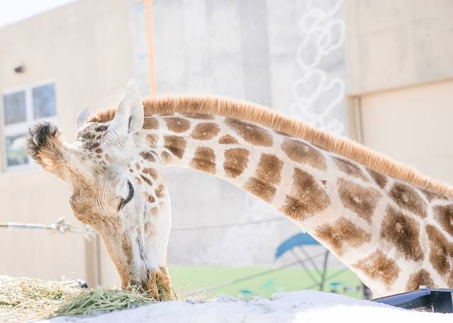 企鹅漫步结束后往下坡走就是长颈鹿馆,长颈鹿也是超级萌的,由于旭川动物园设计太合理了,感觉它再伸长脖子,就可以与他头碰头了。