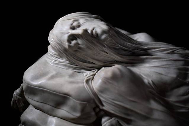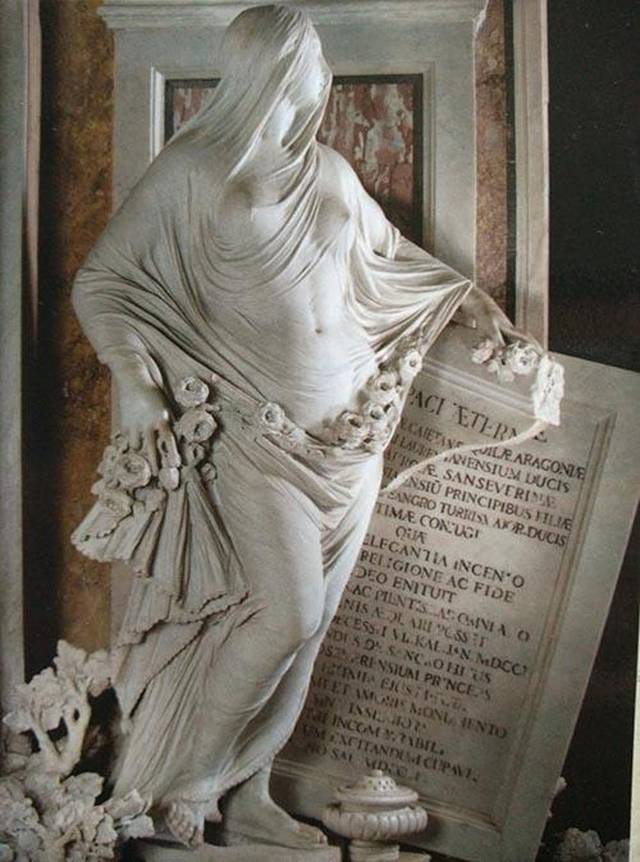 教堂中厅摆放着一尊《裹纱的耶稣》,透过面纱,可以看出耶稣痛苦而狰狞的表情,形销骨立的躯干,能够把这种痛苦传达给观众的雕塑品,创作者是朱塞佩•圣马迪诺。