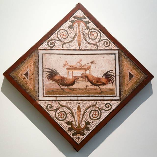 画面里这对斗鸡,是用彩色的方块石头拼接出来的,类似于 中国 十字绣的色块原理。公元前的作品啊,看得出来鸡的神态动作吗,真的超级生动。