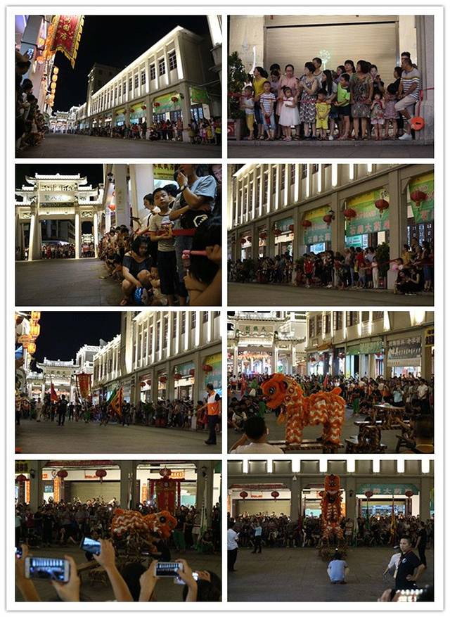 看完灯光表演,再次回牌坊街时发现围满了人,一问得知8点半开始有巡游表演,于是我们又在人群中等待,原来是舞狮表演。
