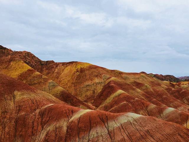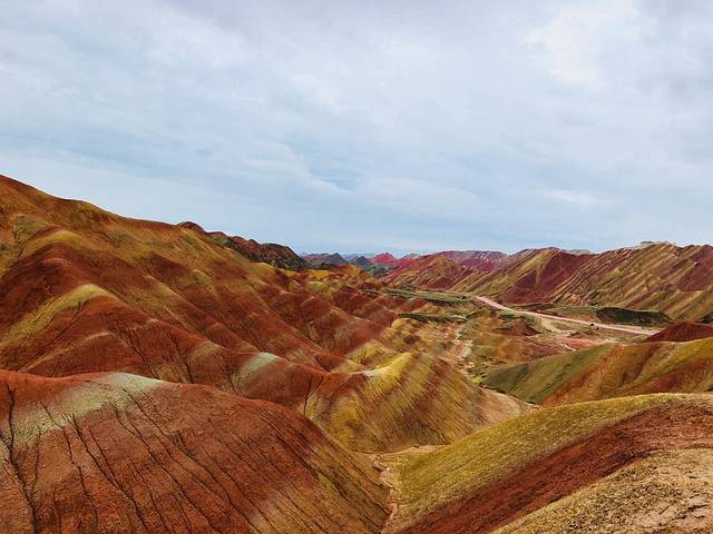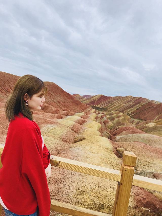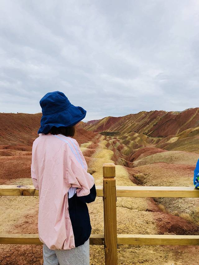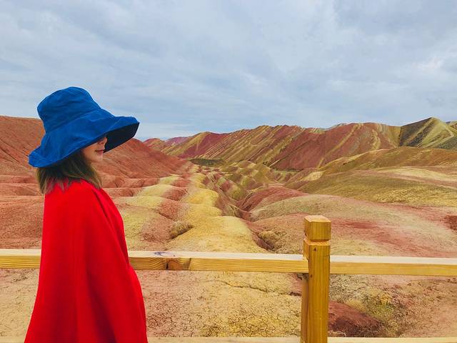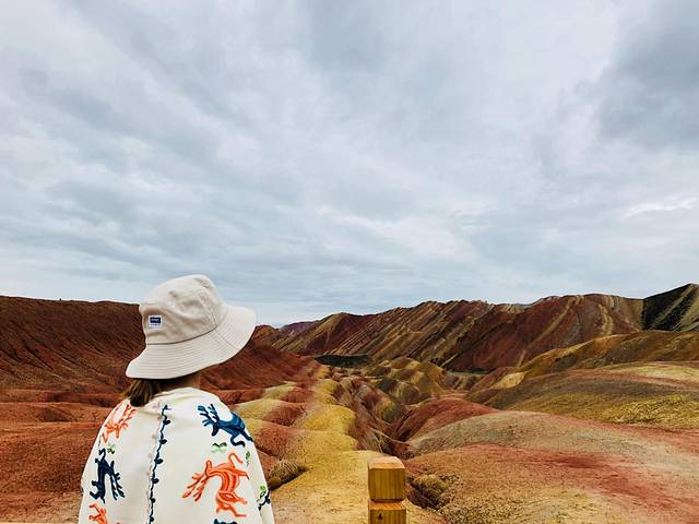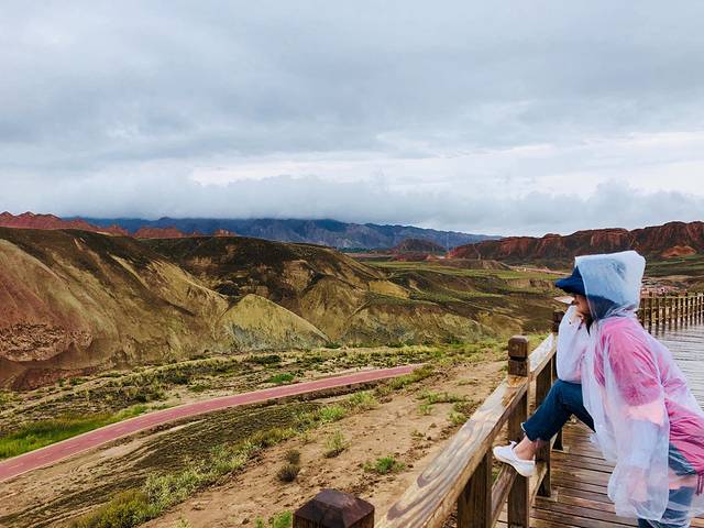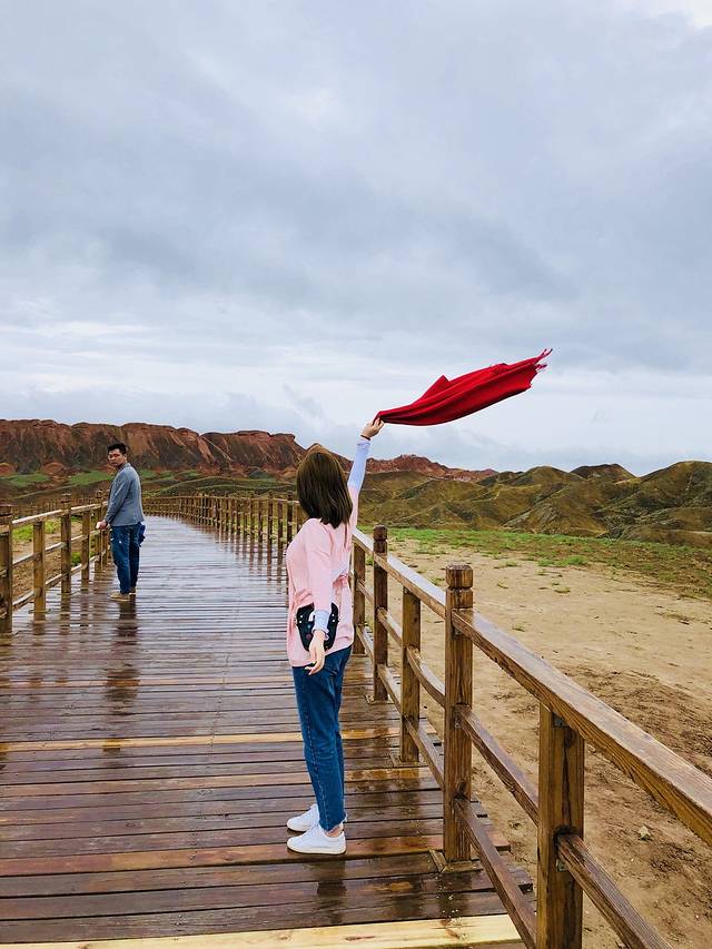 因为我们开车太累,决定坐火车游大环线,一早的动车西宁到张掖,两个小时就到了。到了以后从客运西站直接有去丹霞地质公园的大巴,我们坐上直接到景区门口,买了票进去里边还要坐车去几个观景台看不同的地质风貌,前几天我们就大概看了下,直奔最后一个观景台,因为我想做热气球,结果到了之后没有,因为下雨了,热气球没坐成,滑翔机也坐不成,但风景还是不错的,从来没有见过这样的好几层色彩的山石,也不遗憾,逛完一圈返回景区门口,做了回市区的大巴,搜了下大众点评,有家甘州名吃的店评分很高,我们去点了酿皮,铁锅焖饼,有个什么凉调的三样有茄子辣椒,酸奶,他家的饭超好吃,好多特色,如果不是人太少我们就点好多好多了,他家的酿皮是继兰州北站之后吃过的最好吃的酿皮,下次去还去他们家吃,然后去了火车站,买了睡到第二天早上的到敦煌的卧铺,直接睡到敦煌。