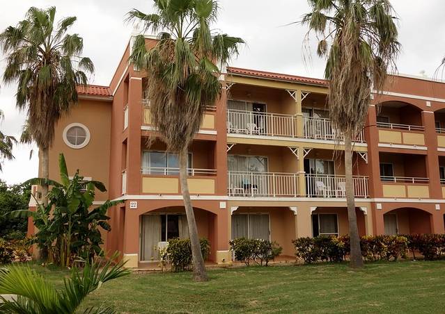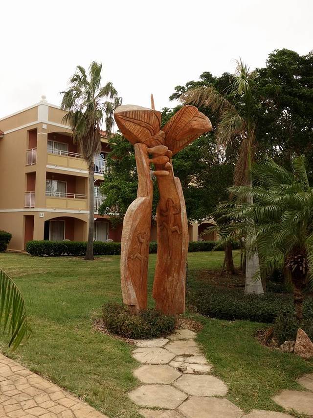 放下行李之后,我们就去海边。从我们的房间到海滩,可以坐酒店的电瓶车,走去也只要几分钟。图为通向海边的一个加勒比风格的拱门。