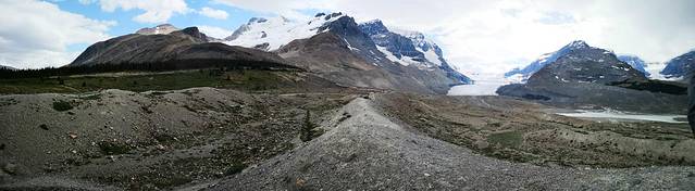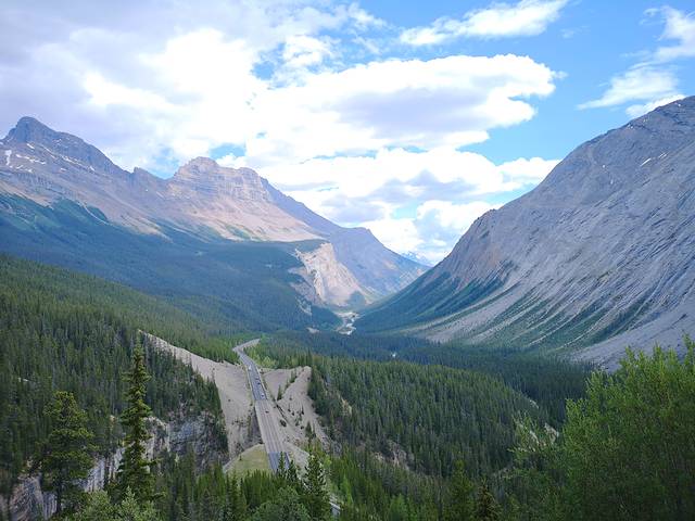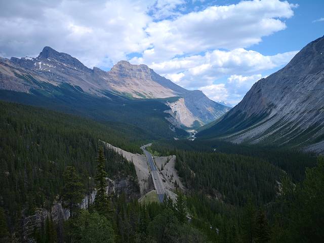 加拿大落基山的精华部分,主要在班夫(Banff)和贾斯珀(Jasper)两个国家公园。这两个地方,一个在南、一个在北,相当于加拿大落基山旅游区的一南一北两个大门。去落基山旅游,可以选择班夫进、贾斯珀出,也可以反过来,选择贾斯珀进、班夫出。当然也可以选择班夫一地进出,前提是不去贾斯珀。(下图:班夫与贾斯珀之间的“冰原高速公路”风光。)