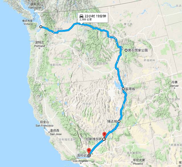 西雅图自驾到拉斯维加斯约2900公里,拉斯维加斯飞洛杉矶约1小时。