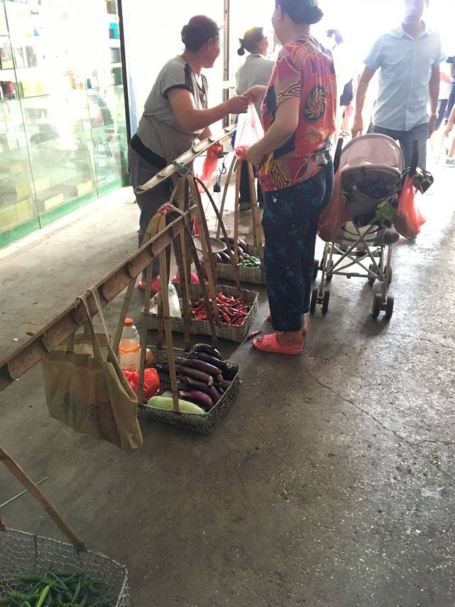 农家阿嫂卖自家种的蔬菜,挑的担子不错