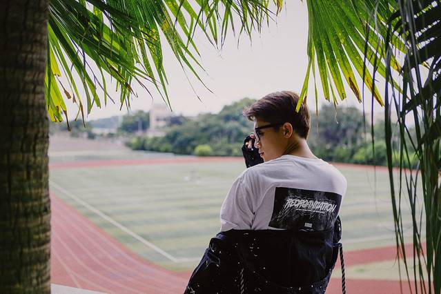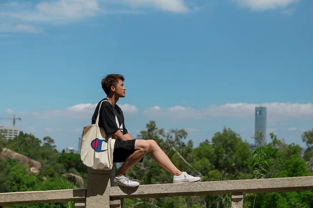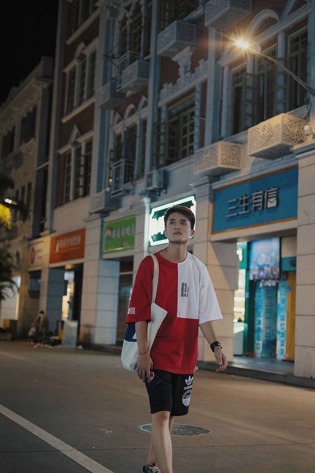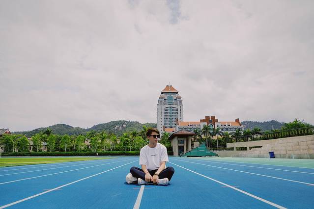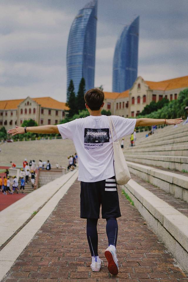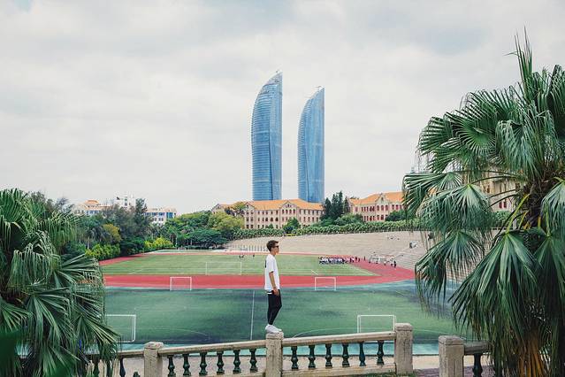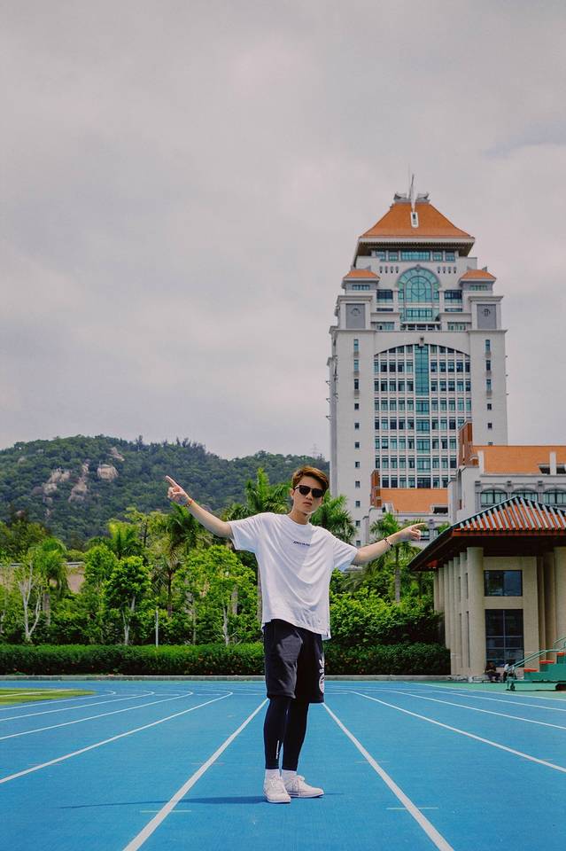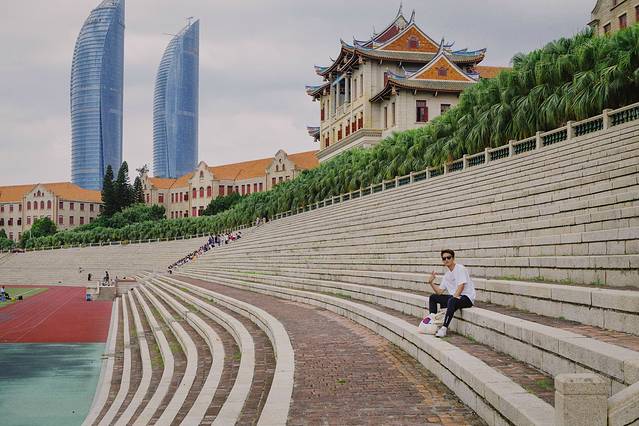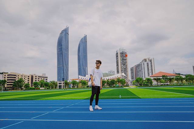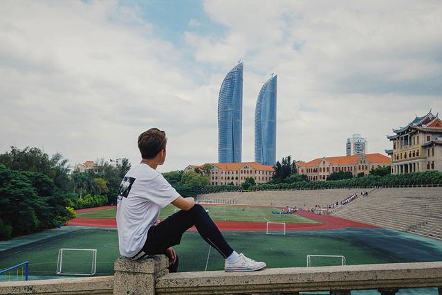 当然,只拍操场,或者单纯的拍人像是不够的,需要通过不同的角度和机位,将操场看台,后面特色的红瓦嘉庚建筑以及厦门的城市地标,300米高的双子楼世茂海峡大厦纳入镜头内,这样一张完美展示人与景的美照就产生了。
