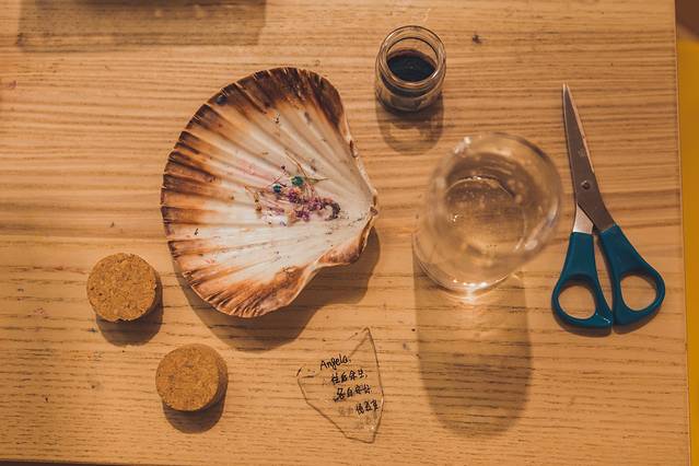 成品就是这样哦~等热的玻璃胶温度慢慢降下来,开始凝固了就可以封上瓶塞了。边上还有一个贝壳,我也充分的利用了起来,在贝壳上写了自己想说的话。