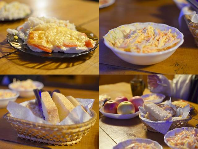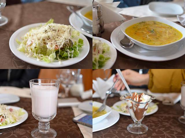 晚饭我们是在旅馆吃的,350RUB/人, 沙拉 、鸡肉饭、酸奶、苹果和吐司,味道就真的很一般啦,尤其是那个饭,感觉完全是跟生的一样,所以后面几天我们都是去外面的餐厅吃的。