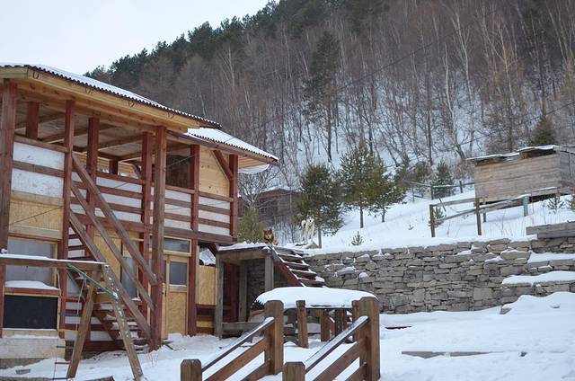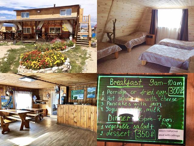 我们在胡日尔村一共住了三晚,前两天住的是奥特迪克纳贝卡旅馆(Guest House Otdykh na Baykale),这家有个院子,里面大概有四五栋小木屋,我们住在餐厅后面那一栋的二楼,是一个四人间,里面是四张小床。民宿有个会讲英文的妹纸,沟通起来还算顺畅,我们在这家订了南线是1200RUB,不过这家貌似只能收现金,不能刷卡的样子。