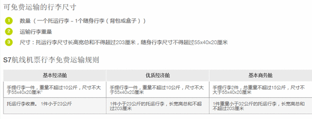 注:除了S7官网订票,都不包含行李。登机箱重量不超10KG,体积不超55*40*20,基本20寸的箱子都OK,随身小包不计算在行李数量内。非托运行李需另外收费,建议多人出行可以其中一人买含行李的机票。
