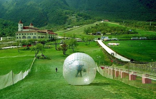 悠波球是个非常有趣的项目。游客将身体固定在一个中空的双层充气大圆球里,从倾斜的草坡上滚下去。颠倒的世界,选装的视野,失重的感觉,让人又爱又恨。这是证明自己是勇敢者的一个项目,不过观众似乎更高兴。