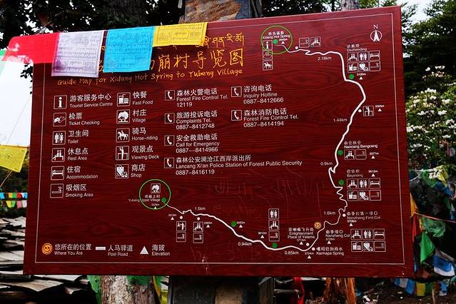在酒店餐厅吃过早饭, 9:00我们一行乘车离开飞来寺,下山过江,10:17到达西当村温泉,大车就只能到这里了,这里便是我们今天徒步的起点。