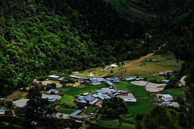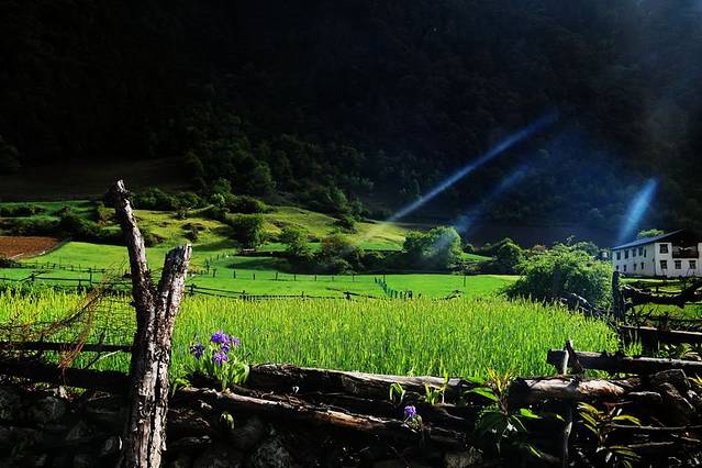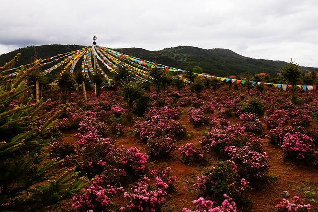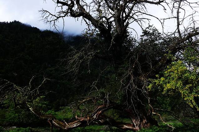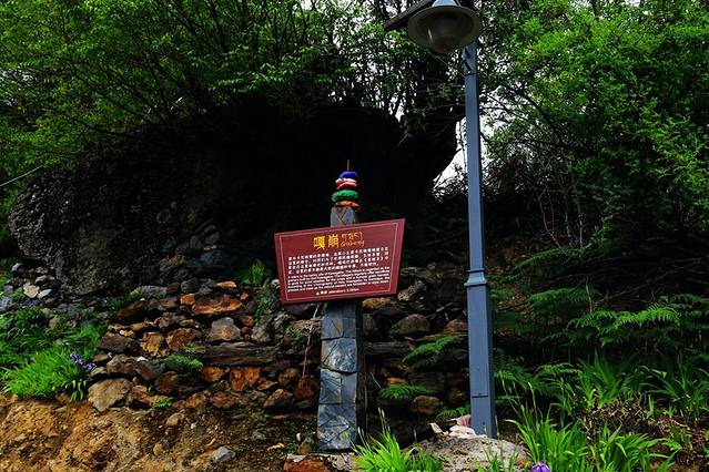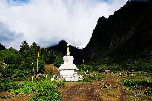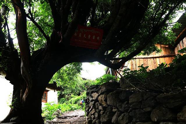 过桥上坡就到雨崩下村了。一棵大树弯曲的树枝就如同进入雨崩下村的一扇大门,穿过这扇大门,眼前出现一座小丘:嘎崩,意为卡瓦格博的青稞堆,是卡瓦格博神建立在这里的粮仓,村民们为了求得风调雨顺、五谷丰登,经常会在这里做祭祀和供养,噶玛巴活佛在《圣地志》中说,这里的草木是天然的幛幡和伞盖,不能随意砍伐的。小丘处的海拔为3065米。