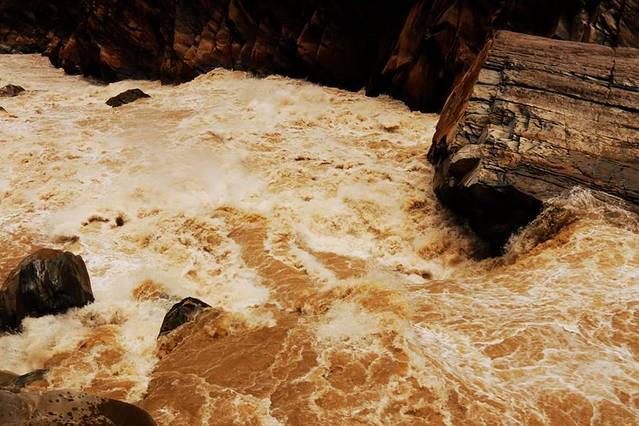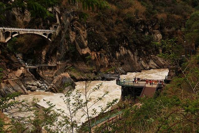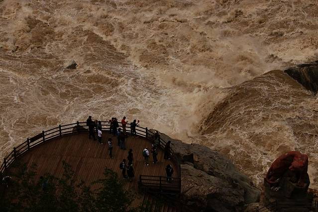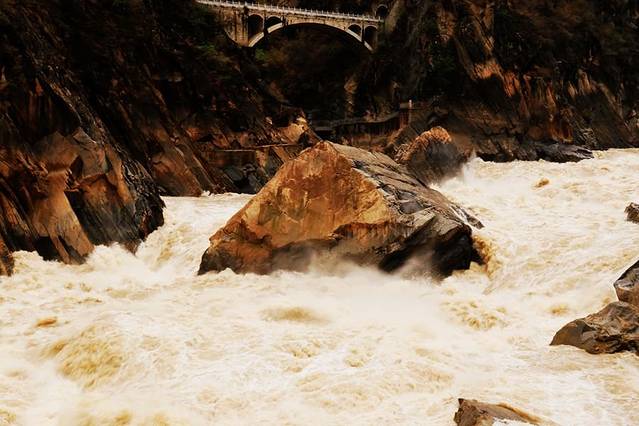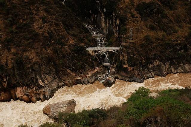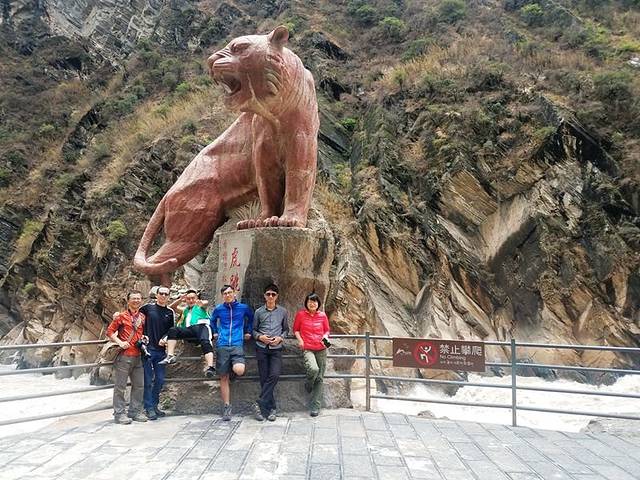 途中11:31到虎跳峡镇,在路边的格桑花饭店吃午饭,12:26饭后顺带去了游上虎跳峡,这里才是我2006年第一次来过的那个虎跳峡,不似前两天去的中虎跳峡的那种山野小路,沿景区步行栈道下行来到江边,一尊老虎塑像的身后便是浑浊的滚滚金沙江水,比之中虎跳,这里的水流更加汹涌,气势更显壮观。