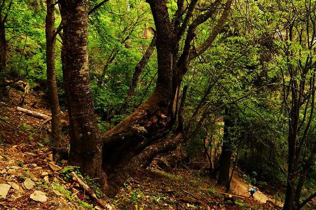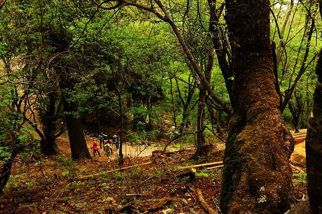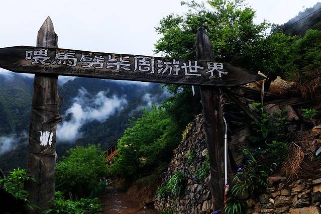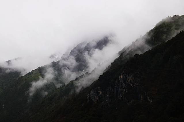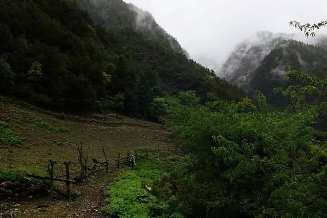 峡谷里、山峦间,云雾蒸腾、弥漫、飘散,景色还是很漂亮的,只是因为下雨,大家更多的时候也就只有低头小心走路,而无心四望观景了。今天的行程,前面约一个半小时是在林中穿行,不断下坡,直至谷底的河边,过桥之后,约10:20我们一行在一处废弃的驿站木屋前躲雨休息。