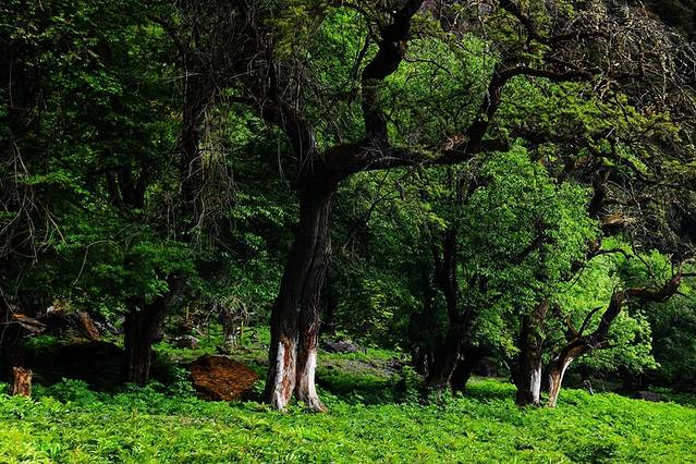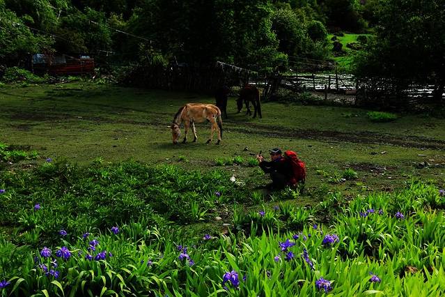 刚出村子,就遇一片漂亮的亚高山草甸,草甸以林间草地的形式呈现,植物群落主要由鸢尾和陆英等杂类草构成,所以又叫鸢尾、陆英草甸。草甸周围是茂密浓郁的云南沙棘林,由滇西北特有树种云南沙棘构成,混生有西南花楸、丽江山荆子、合腺樱等落叶树种,有很强的水土保持功能,据说尤其每到秋季,沙棘浆果就会变成金黄色,非常好看。